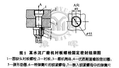 所以水泥廠從國外引進(jìn)生料磨、水泥球磨機(jī)等多種設(shè)備投入運(yùn)轉(zhuǎn)。其襯板固定螺栓采用了帶彈簧片的鎖緊螺母和碟形墊圈加優(yōu)質(zhì)耐溫像膠密封圈進(jìn)行緊固和密密封等新型結(jié)構(gòu),使用多年來一直很理想,如圖1所示。